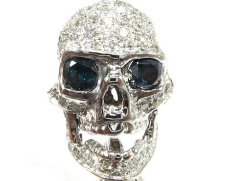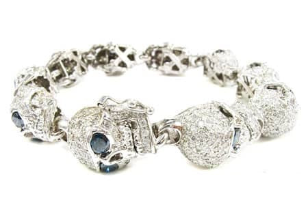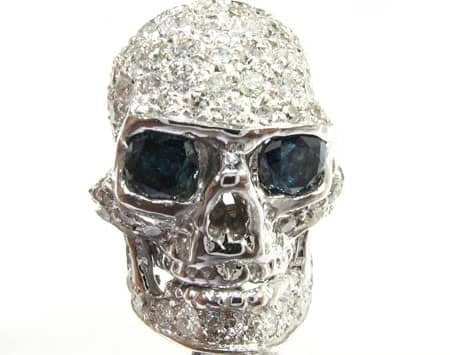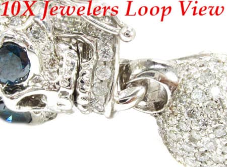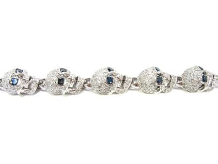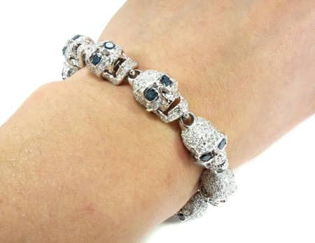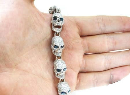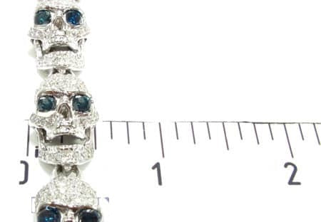 Brace yourself for this beautiful bracelet of bones. A rare and chilling piece from our Men’s Diamond Bracelet collection, these sparkling skulls will boost your swagger. custom jewelry department fashioned these bad boy links from 15.60 ct Round cut diamonds, White for the bone and Blue for the eyes, on 14k White Gold skull settings. Each individual head has a different look: open jaw, closed jaw, sneering, surprised, scary, etc. Bracelets for Men are quickly becoming an indispensable style statement, and with pieces like this, it’s easy to see why. If skulls are your thing, feast your eyes on our wide selection of Diamond Skull Pendants. ‘X’ marks the spot—no bones about it.
