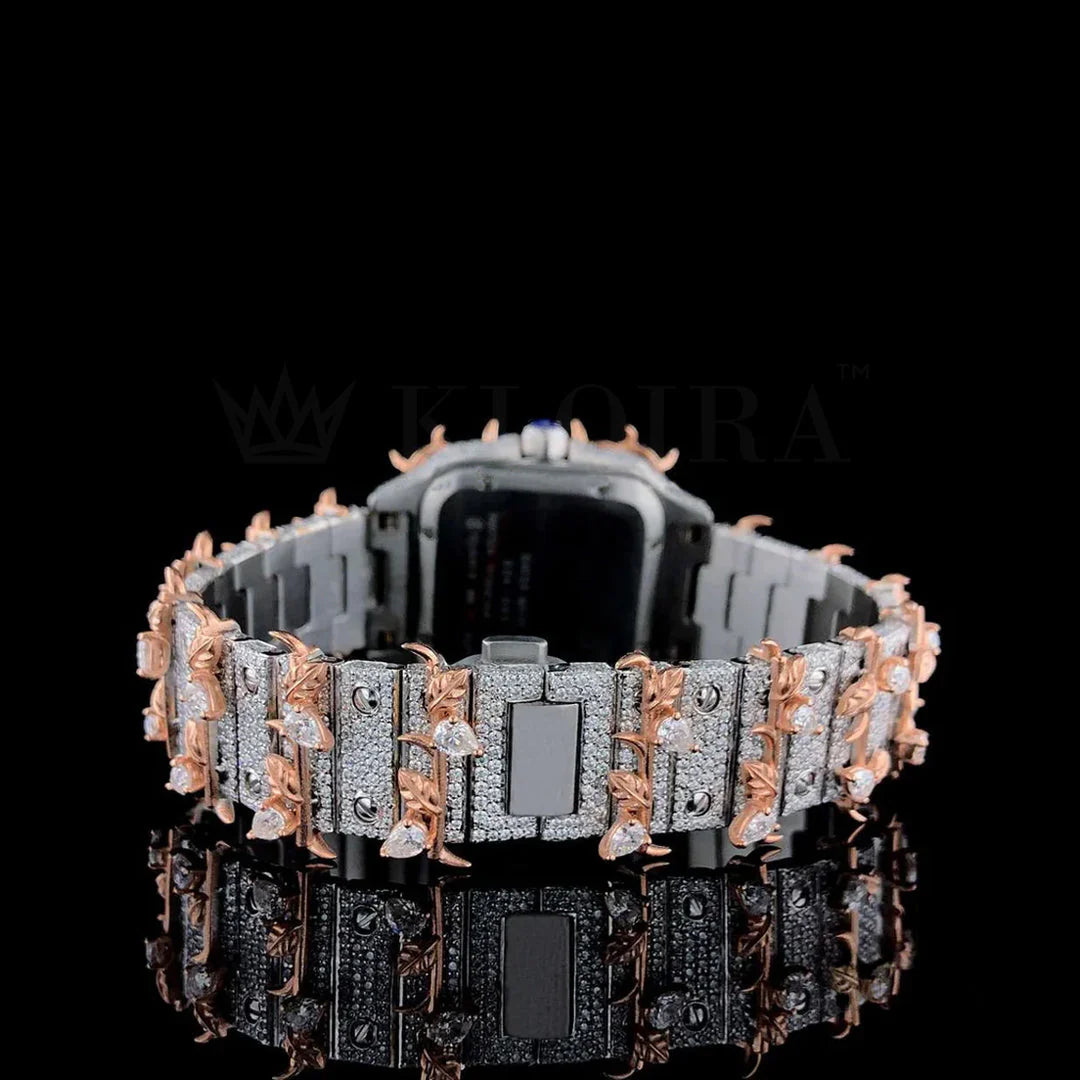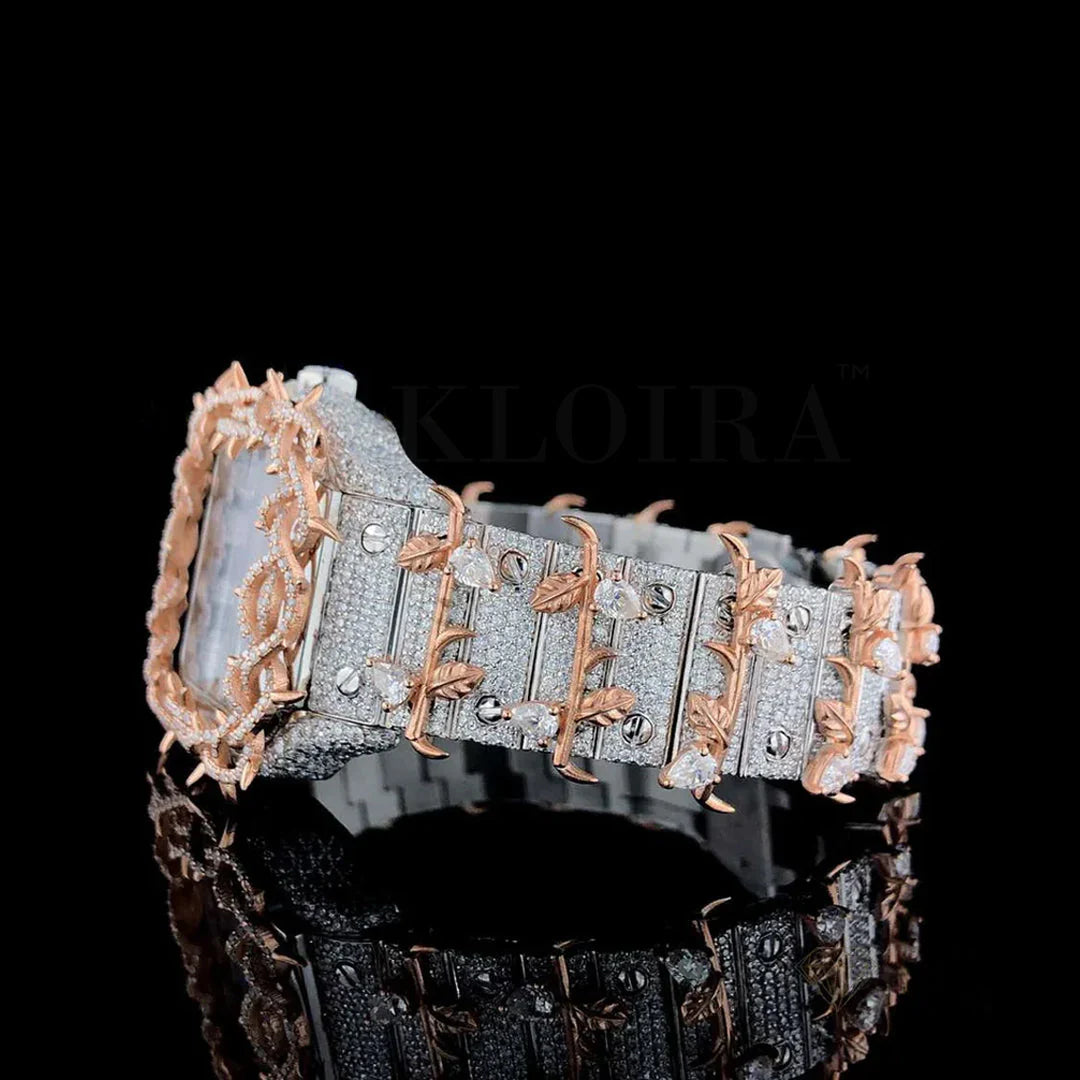 Dynamic elegance and technical excellence come together in the Cartier Thorn Obsidian Moissanite Diamond Watch 14K Gold VVS 30 Carat 41mm, combining standout style with robust construction. This sophisticated timepiece is adorned with over 3,000 Moissanite diamonds totaling 30 carats, each chosen for their D–E color, VVS clarity, and exceptional brilliance. A bright white dial set within a 41mm 14K gold-plated case creates a refined and luxurious appearance, while the stainless steel caseback adds durability. The Cartier Thorn Obsidian Moissanite Diamond Watch is powered by a self-winding automatic movement and offers reliable water resistance up to 100 meters.