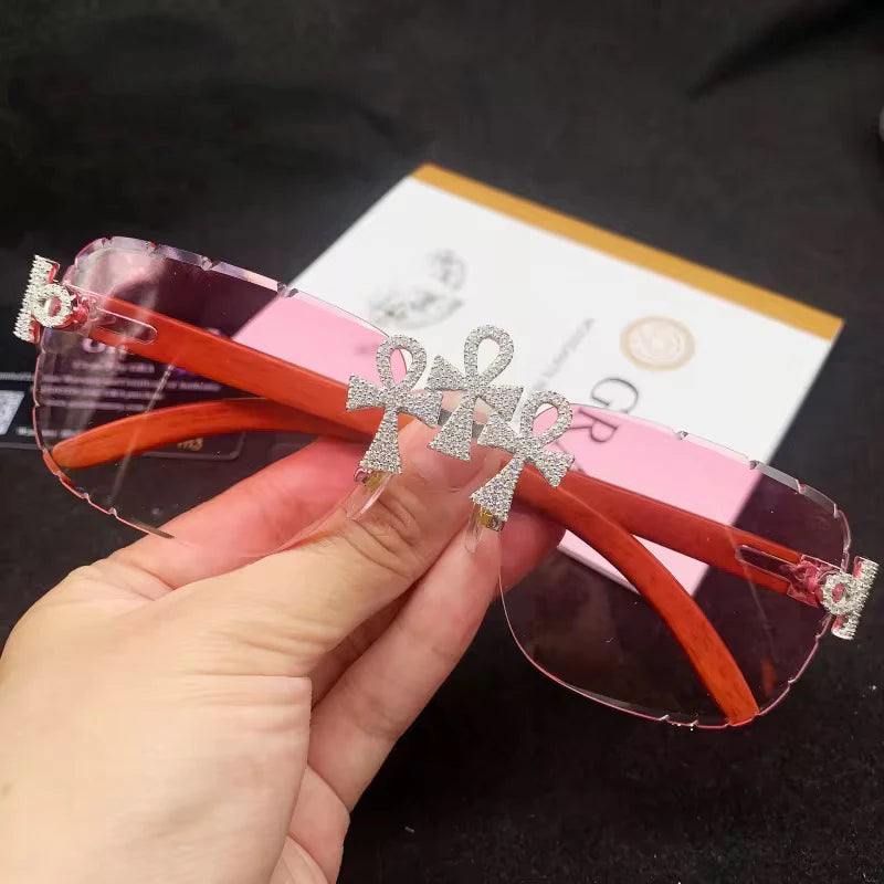 Customhiphopofficial exclusive Moissanite Diamond Pink Sunglasses 14K Gold is now available, crafted with a foundation of 925 sterling silver and coated with a robust layer of 14K white gold via PVD plating.