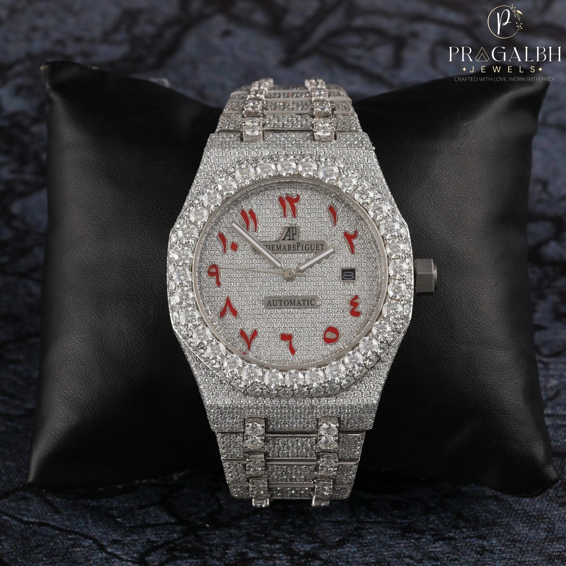 โฅ ๐๐๐ญ๐๐ก ๐๐๐ญ๐๐ข๐ฅ๐ฌ โ Watch Metal: Stainless Steel (Customized Moissanite Studded) โ Band Metal: Stainless Steel (Customized Moissanite Studded) โ Dial Window Material: Glass โฅ ๐๐ญ๐จ๐ง๐ ๐๐๐ญ๐๐ข๐ฅ๐ฌ โ Making: Handmade - Meticulous craftsmanship by our team of skilled artisans โ Stone: Moissanite โ Stone Shape: ๐๐จ๐ฎ๐ง๐ ๐๐ซ๐ข๐ฅ๐ฅ๐ข๐๐ง๐ญ ๐๐ฎ๐ญ โ Stone Size: 0.8mm,1 .2mm, 1.5mm, 2.5mm Approx. โ Quantity Of Stone: 2500-3000 Pcs Moissanite Approx. โ Stone Color : White (Colorless) โ Clarity: VVS1 โ Hardness (Mohs Scale) : 9.25 โ Brilliance Refractive Index: 2.65 โ Treatment: No Enhancement โ Cut Grade: Excellent โ Polish: Excellent โ Eco-friendly โ Made to Order โ ๐๐ฎ๐ญ๐ก๐๐ง๐ญ๐ข๐๐ข๐ญ๐ฒ ๐๐ฎ๐๐ซ๐๐ง๐ญ๐๐: ๐๐๐ฌ๐ญ ๐๐จ๐ฌ๐ข๐ญ๐ข๐ฏ๐ ๐๐ฒ ๐๐ก๐๐ซ๐ฆ๐๐ฅ ๐๐ข๐๐ฆ๐จ๐ง๐ ๐๐๐ฌ๐ญ๐๐ซ.