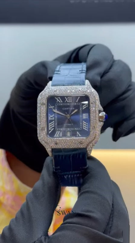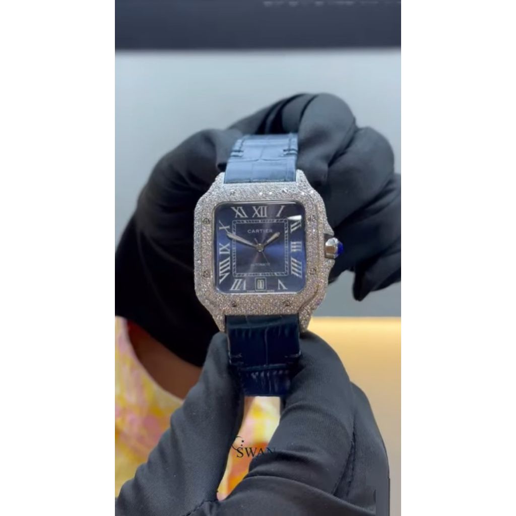 Santos Watch Blue Dial Custom Moissanite Diamonds 39.8mm